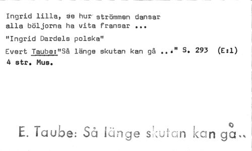 //// Ingrid lilla, Se hur strömmen dansar alla böljorna ha vita fransar S. 293 (E:1) //// "Ingrid Dardels polska" //// Evert Taube:"Så länge skutan kan gå .4" //// 4 str. Mus. //// E. Taube: Så L'Inge sian a n get., ////