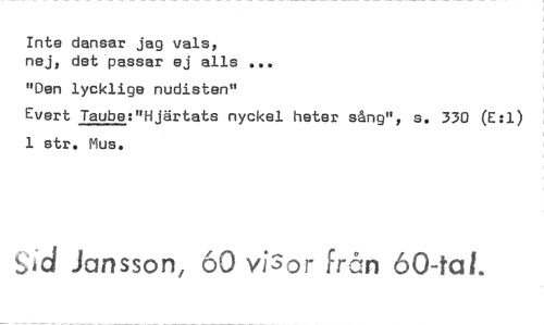 //// Inte dansar jag vals, //// nej, det passar ej alls ... //// "Den lycklige nudisten" //// Evert Taube:"Hjärtats nyckel heter sång", s. 330 (E:1) 1 str. Mus. //// sid Jansson, 60 visor från 60-tal. ////