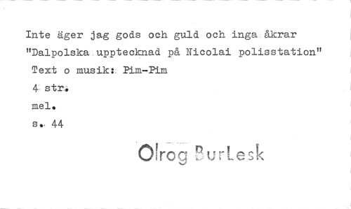 //// Inte äger jag gods och guld och inga åkrar "Dalpolska upptecknad på Nicolai polisstation" Text o musikt. Pim-Pim //// 41 str4 //// mel. //// so, 44 //// Ort- !'"An -1 //// J 1. e i ////