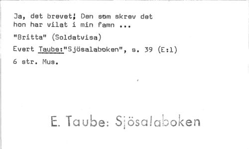 //// Ja, det brevet; Den som skrev det hon har vilat i min famn ... //// "Britta" (Soldatvisa) //// Evert Taube:"Sjösalaboken", s. 39 (E:1) 6 str. Mus. //// E. Taube: SeSsalci--Joken ////