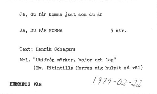//// Ja, du får komma just som du är //// JA, DU FÅR KOMMA 5 str. //// Text: Henrik Schagers //// Mel. "Utifrån mörker, bojor och lag" //// (Ev. Hitintills Herren mig hulpit så väl) //// HEMMETS VÄN ii,"9-61,2 022 ////