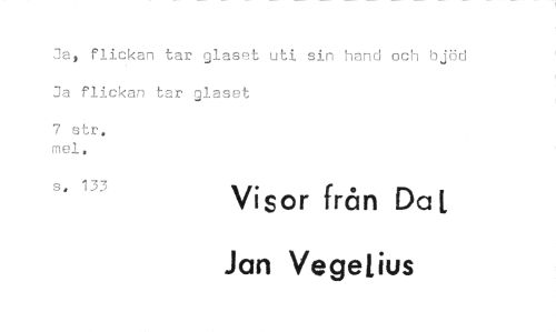 //// Ja, flickan tar glaset uti sin hand och bjöd Ja flickan tar glaset //// 7 str. mei. //// s. 133 Visor från Dal //// Jan Vegelius ////