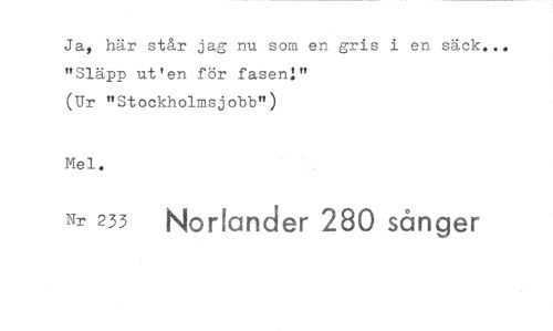 //// Ja, här står jag nu som en gris i en säck... "Släpp ut'en för fasen!" //// (Ur "Stockholmsjobb") //// Mel. //// Nr 233 Noriander 280 sånger ////