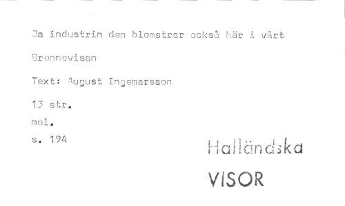 //// Ja industrin den blomstrar också här i vårt Brennevisan //// Text: August Ingemarsson //// 13 str. //// s. 194 Halländska //// VISOR ////