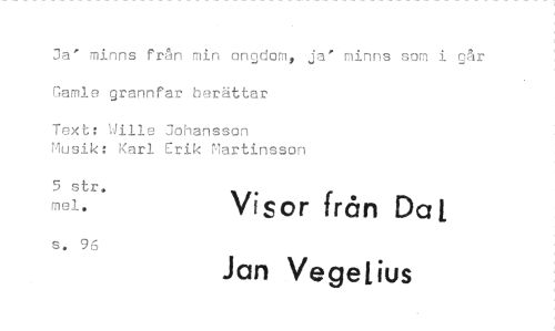 //// Ja' minns från min ongdom, ja' minns som i går Gamle grannfar berättar //// Text: Wille Johansson Musik: Karl Erik Martinsson //// 5 str. mel. Visor från Dal //// s. 96 Jan Vegelius ////