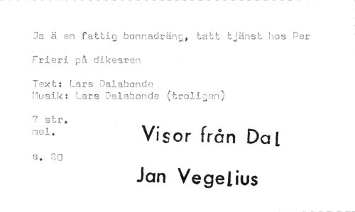 //// Ja ä en fattig bonnadräng, tatt tjänst hos Per Frieri på dikesren //// Text: Lars Dalabonde //// Musik: Lars Dalabonde (troligen) //// 7 str. mei. Visor från Da t //// s. 80 Jan Vegetius ////