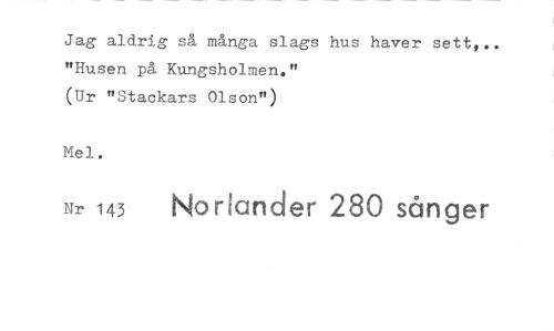 //// Jag aldrig så många slags hus haver sett,.. "Husen på Kungsholmen." //// (Ur "Stackars Olson") //// Mel. //// Nr 143 Norlander 280 sånger ////