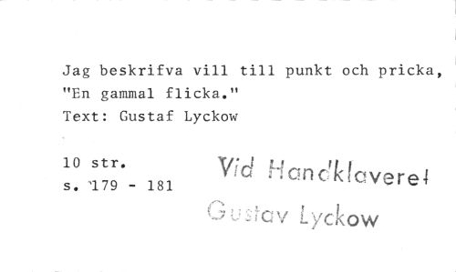 //// Jag beskrifva vill till punkt och pricka, "En gammal flicka." //// Text: Gustaf Lyckow //// 10 str. //// s. 179 181 //// '7; jav Lyekow //// Hanälevere4 ////