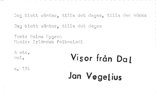 //// Jag blott väntar, tills det dagas, tills den mörka Jag blott väntar, tills det dagas //// Text: Selma Nygren //// Musik: Irländsk folkmelodi //// 4 str. mei. Visor från Dal //// s. 134 Jan Vegelius ////