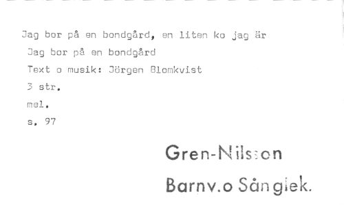 //// Jag bor på en bondgård, en liten ko jag är Jag bor på en bondgård //// Text o musik: Jörgen Blomkvist //// 3 str. //// mei. //// s. 97 //// Gren-N isson //// Barnv.o Sån giek. ////