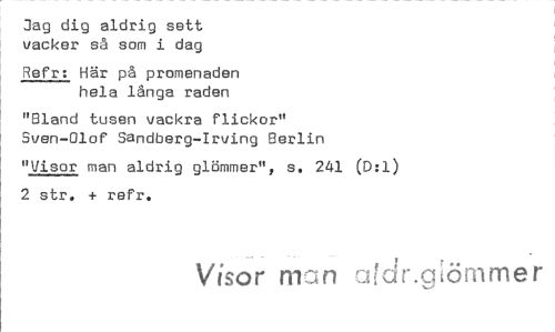 //// Jag dig aldrig sett //// vacker så som i dag //// Refr: Här på promenaden hela långa raden //// "Bland tusen vackra flickor" Sven-Olof Sandberg-Irving Berlin //// "Visor man aldrig glömmer", s. 241 (D;1) 2 str. + refr. //// Vis©r man dr.g;örnmer ////