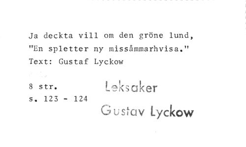 //// Ja deckta vill om den gröne lund, "En spletter ny missåmmarhvisa." Text: Gustaf Lyckow //// 8 str. Leksaker //// s. 123 - 124 //// Gustav Lyckow ////
