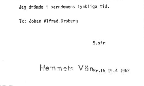 //// Jag drömde i barndomens lyckliga tid. Tx: Johan Alfred Broberg //// 5.str //// Hemme VanNr.I6 19.4 1962 ////