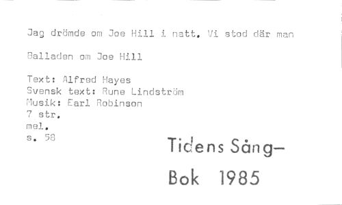 //// Jag drömde om Joe Hill i natt. Vi stod där man Balladen om Joe Hill //// Text: Alfred Hayes //// Svensk text: Rune Lindström Musik: Earl Robinson //// 7 str, //// mel. //// s. 58 Tidens Sång— //// Bok 1985 ////