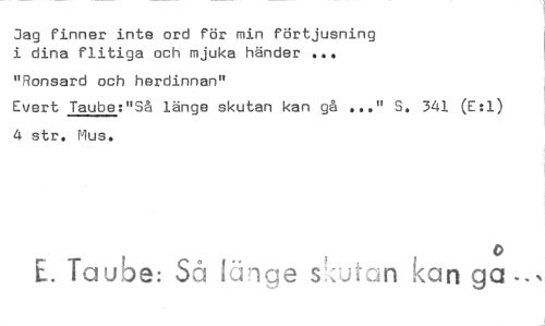 //// Jag finner inte ord för min förtjusning i dina flitiga och mjuka händer ... S. 341 (E:1) //// "Ronsard och herdinnan" //// Evert Taube:"Så länge skutan kan gå 4 str. Mus. //// 0 //// E. Taube: 55 "j4-1 e s;',) t a rl kan gc] ////
