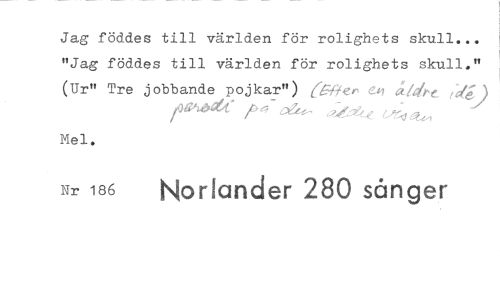 //// Jag föddes till världen för rolighets skull... "Jag föddes till världen för rolighets skull." (Ur" Tre jobbande, pojkar") L'"t-iyer, a7d,' 149 //// /14.4:,,b,' -9%; //// Mel. //// Nr 186 Norlander 280 sånger ////
