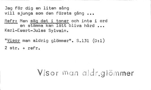 //// Jag för dig en liten sång //// vill sjunga som den första gång ... //// Refr:Men säg det i toner och inte i ord en stämma kan lätt bliva hård ... Karl-Ewert-Jules Sylvain. //// "Visor man aldrig glömmer". S.131 0:1) 2 str. refr. //// Visor man aidr.gi&-nmer ////