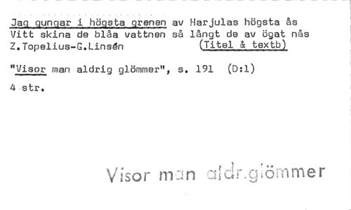 //// Jag gungar i högsta grenen av Harjulas högsta ås Vitt skina de blåa vattnen så långt de av ögat nås Z.Topelius-G.Linstån (Titel & textb) //// "Visor man aldrig glömmer", s, 191 (D:1) 4 str. //// Visor min Yicire ioximer ////