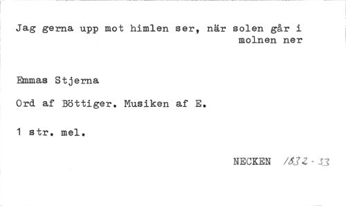 //// Jag gerna upp mot himlen ser, när solen går i //// molnen ner //// Emmas Stjerna //// Ord af Böttiger. Musiken af E. 1 str. mel. //// NECKEN 453Z-j3 ////