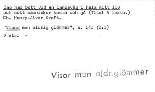 //// Jag har bott vid en landsväg i hela mitt liv och sett människor komma och gå (Titel & textb.) Ch. Henry-Alvar Kraft. //// "Visor man aldrig glömmer", s. 141 (0:1) 3 str. //// Visor rrn:n ci;dr.görnmer ////