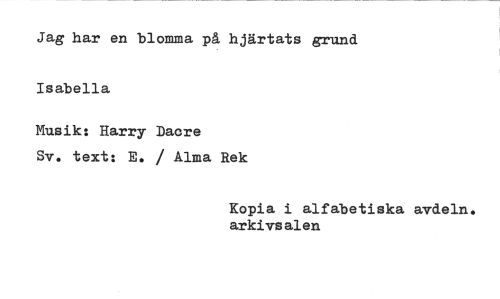 //// Jag har en blomma på hjärtats grund //// Isabella //// Musik: Harry Daere //// Sv. text: E. / Alma Rek //// Kopia i alfabetiska avdeln. arkivsalen ////