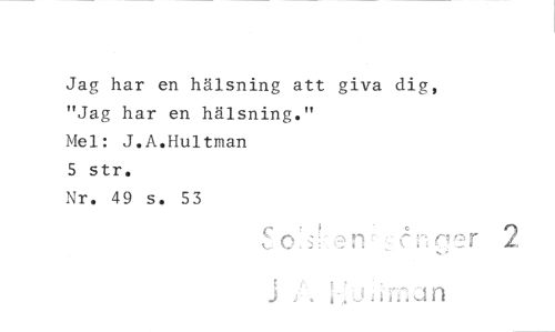 //// Jag har en hälsning att giva dig, "Jag har en hälsning." //// Mel: J.A.Hultman //// 5 str. //// Nr. 49 s. 53 //// cin r 2 ////