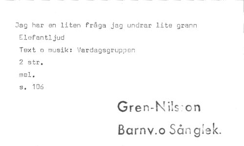 //// Jag har en liten fråga jag undrar lite grann Elefantljud //// Text o musik: Vardagsgruppen //// 2 str. //// mel. //// s. 106 //// Gren-Nils-on //// Barnv.o Sån g:ek. ////