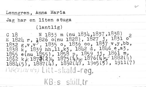 //// Lenngren, Anna Maria Jag har en liten stuga //// (lantlig) //// C 18 N 1833 m (nu 1834,1837,1838) 2 //// E 1824. r, 1826 o(nu 1828), 1827 j, 1831 o 1832 g,v,v}, 1835 o, 1836,00, 1837 v,y,bb, 1838 k, 1831 hh,11k3, 18142 d, 1846 e,a3, 1855 e(nu 1 55), 1858 p, 1859 jj, 1.861 m‘, 1862 k t, 187 ( );‘,- 1875W-94 1876(4)5- 1882(4) 1884(5), 1887(14), 1B92(43, 1905(5), 1911(7) //// KB:s skUt.tr ////