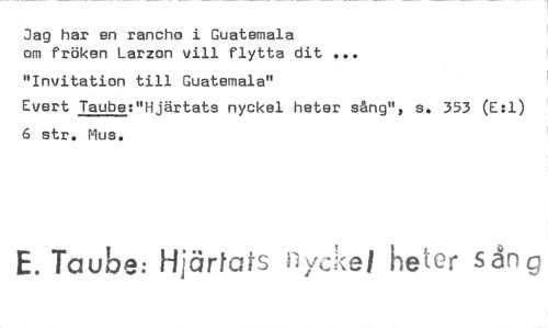 //// Jag har en rancha i Guatemala //// om fröken Larzon vill flytta dit //// "Invitation till Guatemala" //// Evert Taube:"Hjärtats nyckel heter sång", s. 353 (E:1) 6 str. Mus. //// E. Taube: Hjärtats nyckel heter sång ////