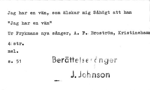 //// Jag har en vän, som älskar mig Såhögt att han "Jag har en vän" //// Ur Frykmans nya sånger, A. Fe Broström, Kristinehamn //// 4 str. mel //// se 51 BertteLe( ng //// i. Jchnson ////