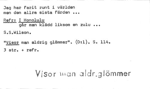 //// Jag har farit runt i världen men den allra sista färden ... //// Refr: I Honolulu //// går man klädd liksom en zulu ... //// S.S.Wilson. //// "Visor man aldrig glömmer". (D:1). S. 114. 3 str. + refr. //// Visor an aidr.jiärnmer ////
