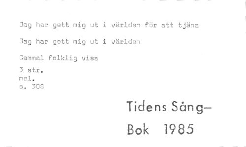 //// Jag har gett mig ut i världen för att tjäna Jag har gett mig ut i världen //// Gammal folklig visa //// 3 str. mel. //// s. 308 //// Tidens Sång— //// Bok 1985 ////