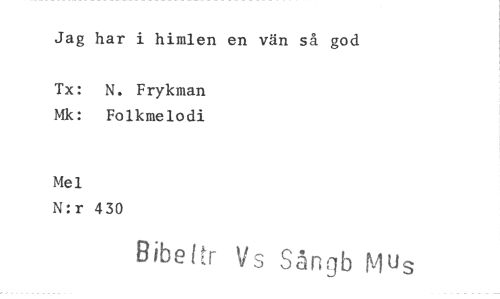 //// Jag har i himlen en vän så god //// Tx: N. Frykman //// Mk: Folkmelodi //// Mel //// N:r 430 //// Bibeltr Vs Sångb Mus ////