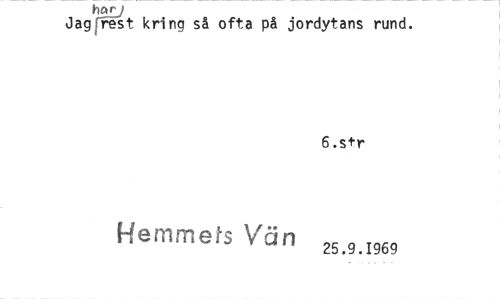 //// 7,2L9 //// Jag rest kring så ofta på jordytans rund. //// 6.str //// Hemmets Vän 25.9.1969 ////