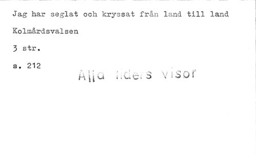 //// Jag har seglat och kryssat från land till land Kolmårdsvalsen //// 3 str. //// s. 212 //// Abel c3 Ni ISO( ////