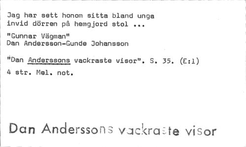 //// Jag har sett honom sitta bland unga invid dörren på hemgjord stol ... //// "Gunnar Vågman" //// Dan Andersson-Gunde Johansson //// "Dan Anderssons vackraste visor". S. 35. (E:1) 4 str. Kiel. not. //// Dan Anderssons v3ckraiite visor ////