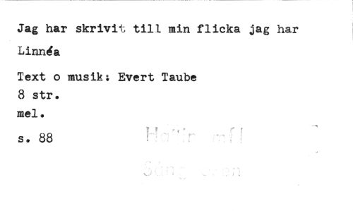 //// Jag har skrivit till min flicka jag har Linnda //// Text o musik: Evert Taube 8 str. //// mel. //// s. 88 ////