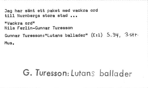 //// Jag har sänt ett paket med vackra ord till Nurnbergs stora stad //// "Vackra ord" //// Nils Ferlin-Gunnar Turesson //// Gunnar Turesson:"Lutans ballader" (E:1) 5.34, Mus. //// G. Turesson: Lutans ballader ////