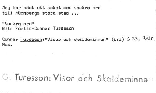 //// Jag har sänt ett paket med vackra ord till Närnbergs stora stad //// "Vackra ord" //// Nils Ferlin-Gunnar Turesson //// Gunnar Turesson:"Visor och skaldeminnen" (E:1) 6:33, 3str Mus. //// Turesson: Visor och Skaldetinne ////