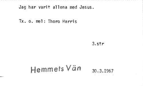 //// Jag har varit allena med Jesus. Tx. o. mel: Thoro Harris //// 3.str //// Hemmets Vän 30.3.1967 ////