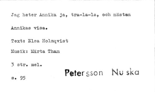 //// Jag heter Annika ja, tra-la-la' och nästan Annikas visa. //// Text: Elsa Holmqvist Musik: Märta Than //// 3 str, mel. s. 95 //// Petersson ska ////