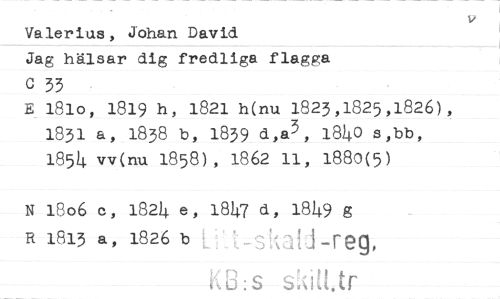 //// Valerius, Johan David //// Jag hälsar dig fredliga flagga //// C 33 //// E 181o, 1819 h, 1821 h(nu 1823,1825,1826), //// 1831 a, 1838 b, 1839 d,a3, 1840 s,bb, 1854 vv(nu 1858), 1862 11, 1880(5) //// N 18o6 c, 1824 e, 1847 d, 1849 g //// R 1813 a, 1826 b //// s: tr ////