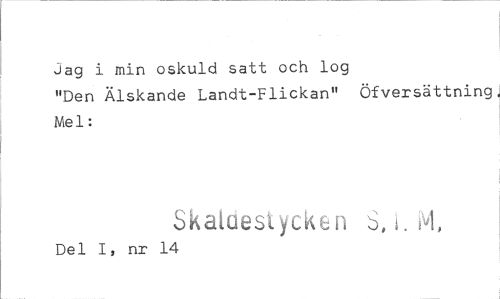 //// Jag i min oskuld satt och log //// "Den Älskande Landt-Flickan" Öfversättning, Mel: //// Skatues cken S, i. //// Del I, nr 14 ////
