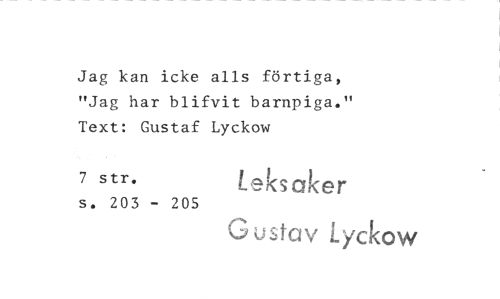 //// Jag kan icke alls förtiga, "Jag har blifvit barnpiga." Text: Gustaf Lyckow //// 7 str. Leksaker //// s. 203 - 205 //// Gustav Lyckow ////