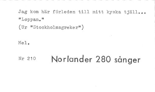 //// Jag kom här förleden till mitt kyska tjäll... "Loppan. tt //// (Ur "Stockholmsgreker") //// Mei. //// Nr 210 Norlander 280 sånger ////