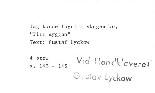 //// Jag kunde lugnt i skogen bo, "Till myggan" //// Text: Gustaf Lyckow //// 4 str. Vid Hanciklavere4 //// s. 143 - 145 //// Ji.av yckow ////