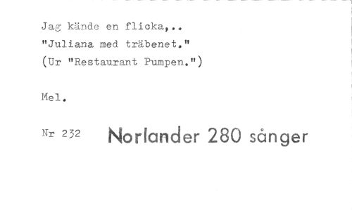 //// Jag kände en flicka". "Juliana med träbenet." (Ur "Restaurant Pumpen.") //// Mel. //// Nr 232 Norlander 280 sånger ////
