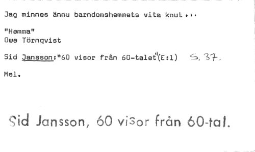 //// Jag minnes ännu barndomshemmets vita knut'', //// "Hemma" //// Owe Törnqvist //// Sid Jansson:"60 visor från 60-taletkE:1) //// Me 1. //// ‹,'id Jansson, 60 visor från 60-tal. ////