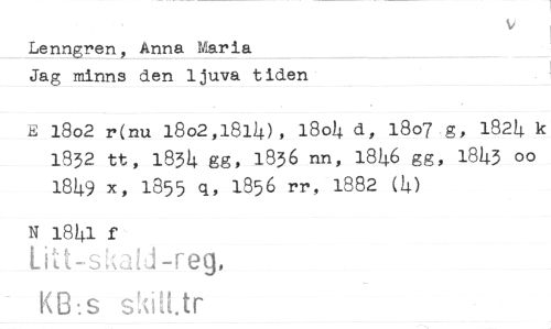 //// Lenngren, Anna Maria //// Jag minns den ljuva tiden //// E 18o2 r(nu 1802,1814), 1804 d, 18o7 g, 1824 k 1832 tt, 1834 gg, 1836 nn, 1846 gg, 1843 00 1849 x, 1855 q, 1856 rr, 1882 (4) //// N 1841 f //// KE3Is skitt.tr ////