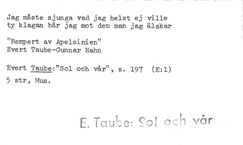 //// Jag måste sjunga vad jag helst ej ville ty klagan bär jag mot den man jag älskar //// "Rempert av Apelsinien" //// Evert Taube-Gunnar Hahn //// Evert Taube:"Sol och vår", s. 197 (E:1) 5 str, Mus. //// E. Taube: So! och vår ////